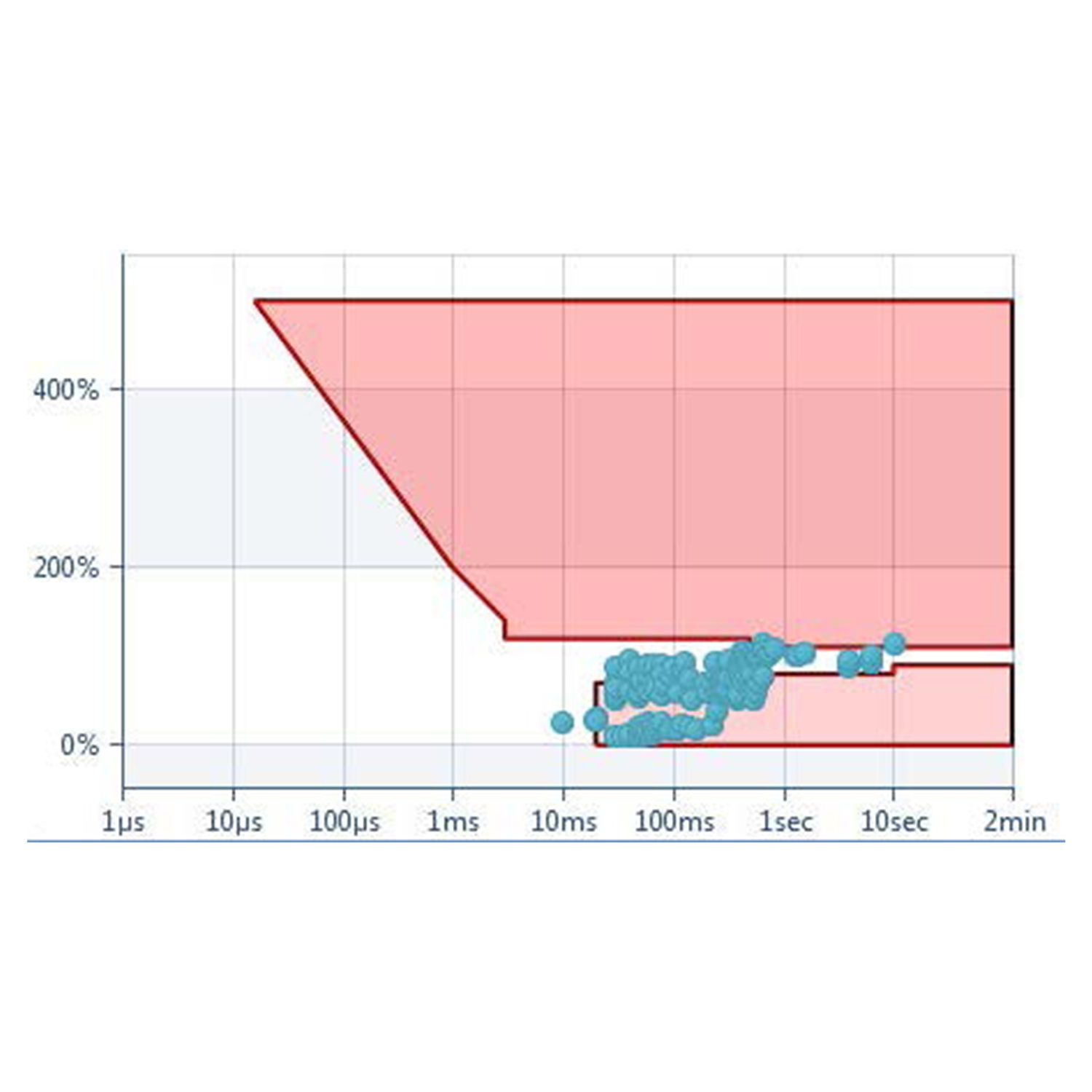 The G4500 analyzer is capable of recording waveform signals continuously. The event configuration doesn’t trigger the recording but rather stores summary logs including start and end time, duration, severity and magnitude of the event. All events can be displayed in a tabular or scatter charts as CBEME/ITIC.