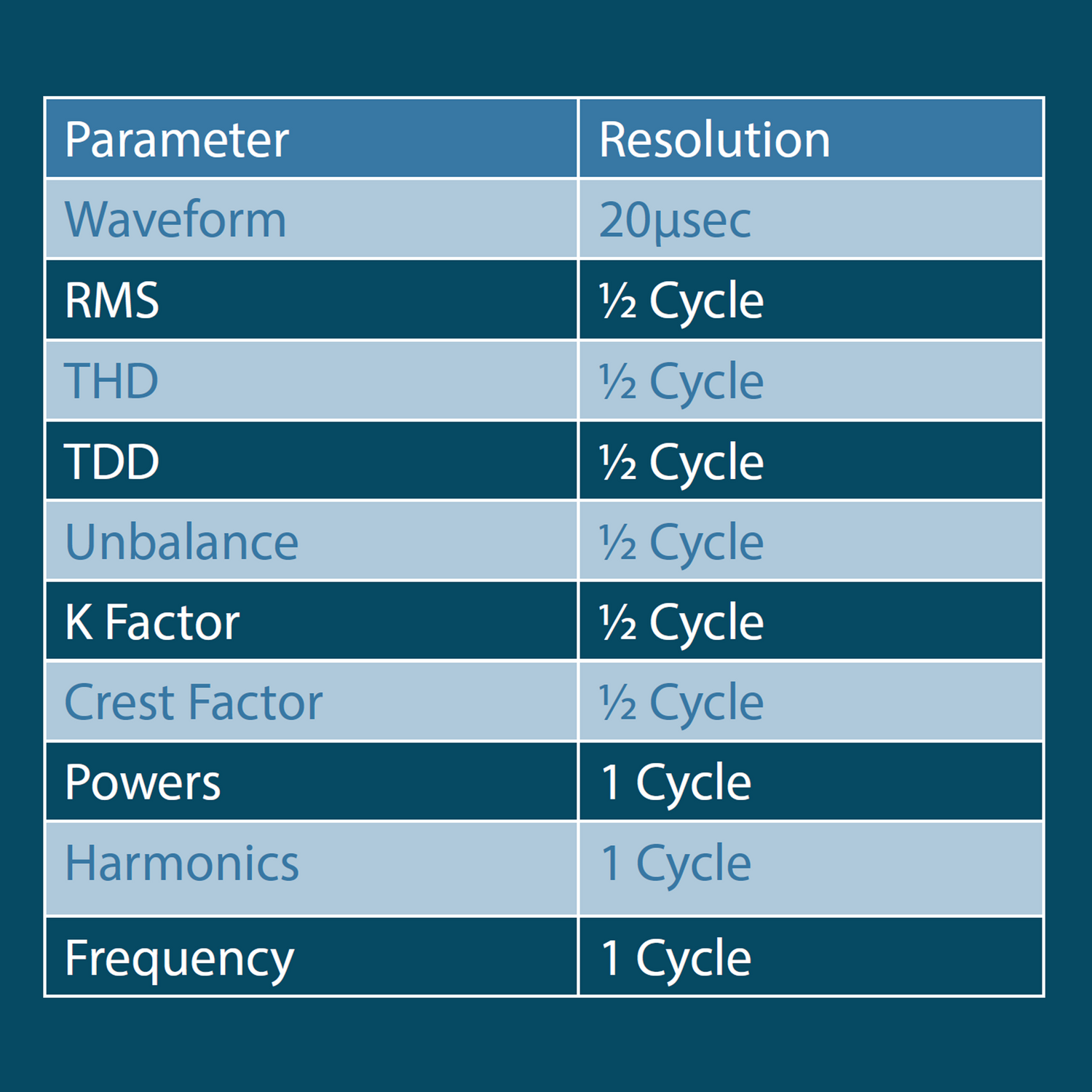 The G4500 Series power quality analyzer measures and records 5,000 power parameters continuously at a resolution of ½ cycles, 10/12 cycles, 150/180 cycles, 10 min and 2 hours of which, any given resolution is calculated for display and reporting purposes. Hence, there is no need to select which parameters to log, and more importantly, which parameters to ignore.