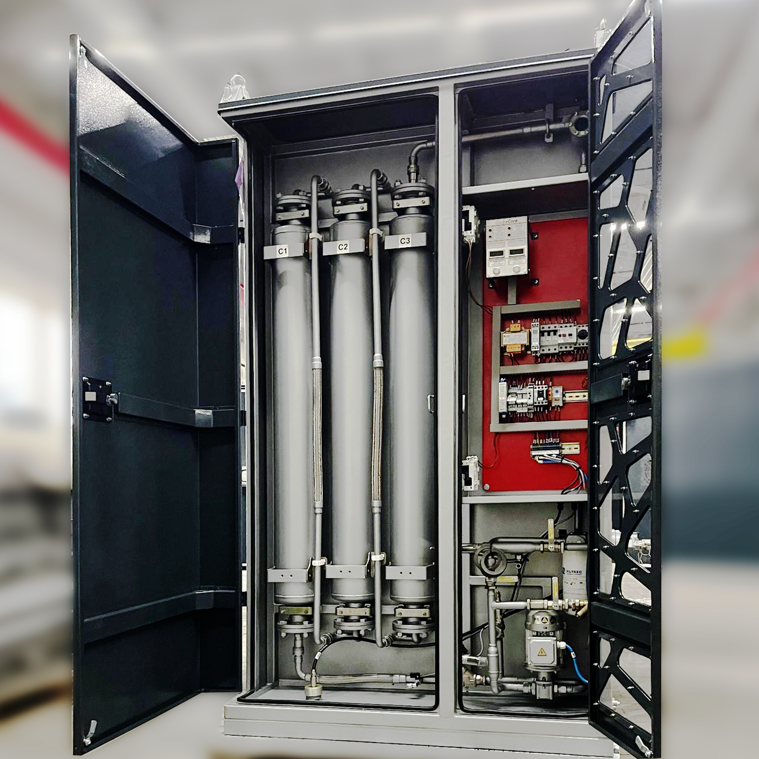 - Monitored by a logic controller displaying oil moisture content before/after drying, filter pressure, and injection pump operation.