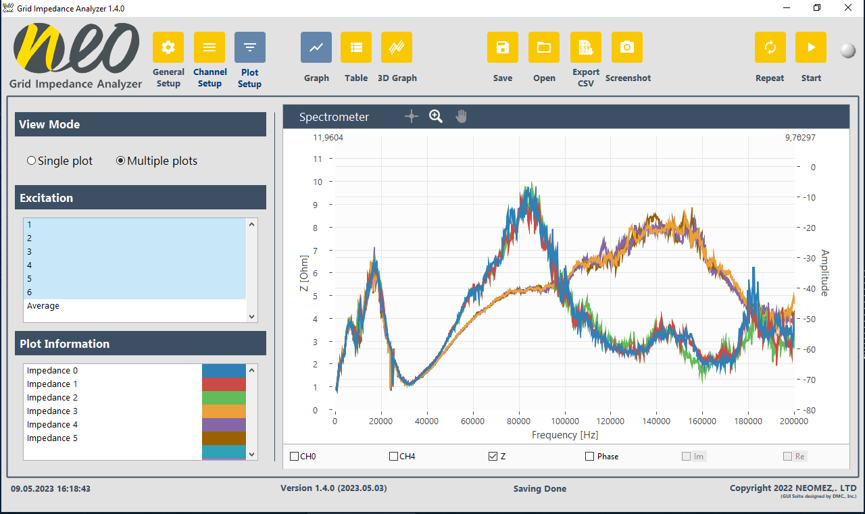 For easy illustration of the time- and frequency-dependent characterization of the mains impedance (grid impedance) of the low-voltage electrical grid, the GIA offers table views, 3D views and spectrometer views.